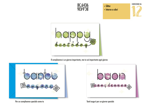 CROMO BIGLIETTI AUGURALI COMPLEANNO LETTERING CON GLITTER BC.6436 - Conf. da 12