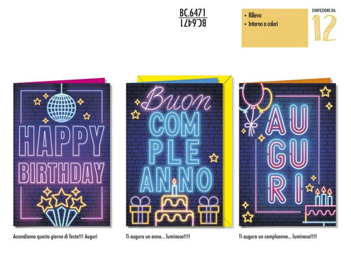 CROMO BIGLIETTI AUGURALI COMPLEANNO HAPPY BIRTDAY NEON BC.6471 - Conf. da 12