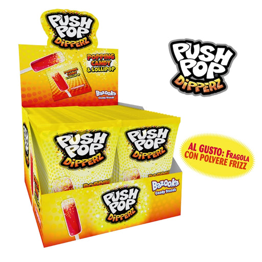 IL NUOVO PUSH POP CON CARAMELLA FRIZZANTE.Lecca lecca con polverina per immersione.AI GUSTI: Cola, fragola, More e Lampone